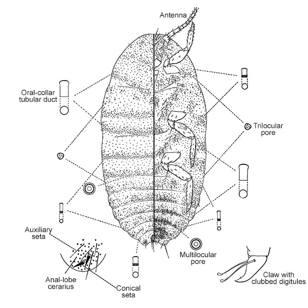Translucent pores present on hind tibia only; oral-collar tubular ducts abundant over dorsum; multilocular pores present on dorsal abdomen, sometimes uncommon; oral-rim tubular ducts absent; 2 pairs of cerarii; oral collars present laterad of anterior spiracles and mid-legs; circulus absent; antennae 8-segmented, 8th segment usually partially or completely divided; claw with denticle.