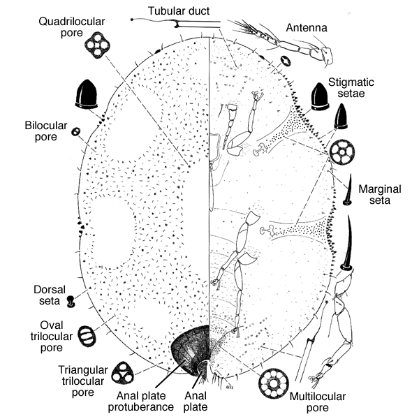 Dorsal setae capitate; about 30 stigmatic setae laterad of each stigmatic furrow, arranged in 3 or 4 rows; stigmatic setae triangular, sides of setae longer than width of base, with bluntly rounded or pointed apices. Other characters: Marginal setae simple; 1 pair of prevulvar setae (often obscured by anal plates); multilocular pores on all abdominal segments and near middle and hind pairs of legs; multilocular pores anterior of anterior spiracle, when present, predominantly with 5 loculi, about same size as pores laterad of anterior spiracle; tibio-tarsal sclerosis present; claw without denticle; claw digitules equal; antennae 7-segmented, rarely with 6; tubular ducts with inner filament unexpanded, present on head and near anal opening; area around anal region sclerotized, forming protuberance; anal plates rounded, without distinct angles; each anal plate with 1 subapical seta, 3 or 4 apical setae, and 1 subdiscal seta; anal fold with 4 fringe setae; preopercular pores inconspicuous, restricted to area anterior of anal plates; without submarginal tubercles.