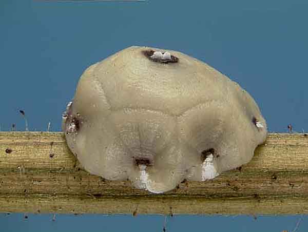 Body oval; convex in lateral view; body dark reddish brown; with a thick wax covering; eggs laid in chamber under body of adult; ovisac absent. The following description is from Gimpel et al. (1974). Test: wet wax rectangular to oval in dorsal view, hemispherical laterally, without horn, dirty to grayish white, with marginal flange small or absent, not hiding lateral filaments, divided into 1 dorsal and 6 lateral plates, with nuclei. Dry wax with filaments as follows: cephalic filament appearing trifurcate, with acute apices; anterolateral and mediolateral filaments simple; posterolateral filaments bifurcate; caudal filaments with weakly divided, bifurcate apices; dorsal dry wax of first and second instars forming small central cap, surrounded by large dorsomedial nucleus, dorsal dry wax not tilted. Stigmatic wax bands directed dorsally, filamentous wax confined to stigmatic areas. Primarily on stems.