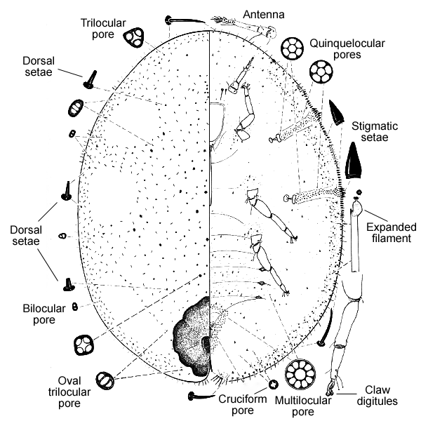 Stigmatic setae not contiguous between anterior and posterior furrow, with several thin marginal setae inbetween; about 28 stigmatic setae laterad of each stigmatic furrow, arranged in 3 irregular rows; without dorsomedial clear area; tubular ducts with inner filament expanded, present submarginally from eye to anterior of anal cleft. Other characters: Dorsal setae cylindrical, apex truncate; stigmatic setae lanceolate, with pointed or slightly rounded apices; marginal setae simple; 1 pair of prevulvar setae (often obscured by anal plates); multilocular pores on all abdominal segments, sometimes present near middle and hind pairs of legs; multilocular pores anterior of anterior spiracle, when present, predominantly with 5 loculi, about same size as pores laterad of anterior spiracle; tibio-tarsal sclerosis absent; claw without denticle; claw digitules equal; antennae usually 6-segmented, rarely 7; area around anal region sclerotized, forming protuberance; anal plates rounded, without distinct angles; each anal plate with 1 subapical seta, 3 or 4 apical setae, and 1 subdiscal seta; anal fold with 6 fringe setae; preopercular pores inconspicuous, restricted to area anterior of anal plates; without submarginal tubercles.