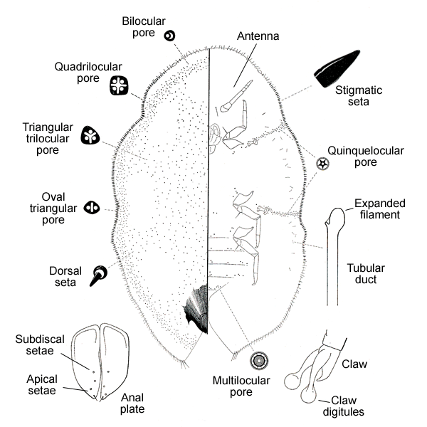 Stigmatic setae contiguous between anterior and posterior furrows; about 60 stigmatic setae laterad of each stigmatic furrow, arranged in 3 irregular rows; without dorsomedial clear area; tubular ducts with inner filament expanded, present submarginally from anterior spiracular furrow to abdomen. Other characters: Dorsal setae cylindrical, apex truncate or broadly rounded; stigmatic setae lanceolate, with pointed or slightly rounded apices; marginal setae simple; 1 pair of prevulvar setae (often obscured by anal plates); multilocular pores on all abdominal segments, sometimes present near middle and hind pairs of legs; multilocular pores anterior of anterior spiracle, when present, predominantly with 5 loculi, about same size as pores laterad of anterior spiracle; tibio-tarsal sclerosis absent; claw without denticle; claw digitules equal; antennae usually 6-segmented, rarely 7; area around anal region sclerotized, forming protuberance; anal plates rounded, without distinct angles; each anal plate with 1 subapical seta, 3 or 4 apical setae, and 1 subdiscal seta; anal fold with 6 fringe setae; preopercular pores inconspicuous, restricted to area anterior of anal plates; without submarginal tubercles.