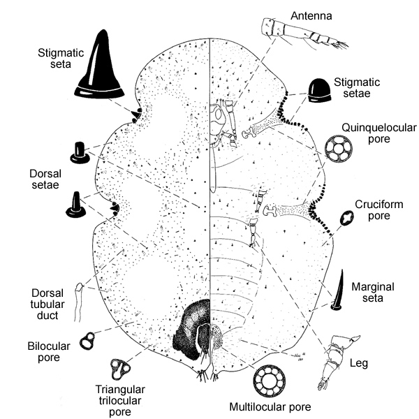 Leg reduced, tibia and tarsus fused; stigmatic setae of 2 distinct sizes, large central seta conical with rounded apex, other setae dome shaped; about 30 stigmatic setae laterad of each stigmatic furrow, arranged in 3 or 4 irregular rows; tubular ducts scattered over dorsum, absent from venter, inner filament unexpanded. Other characters: Dorsal setae cylindrical, apex truncate or broadly rounded; multilocular pores restricted to vulva area; marginal setae simple; 1 pair of prevulvar setae (often obscured by anal plates); multilocular pores restricted to area around vulva; multilocular pores anterior of anterior spiracle, when present, predominantly with 5 loculi, about same size as pores laterad of anterior spiracle; tibio-tarsal sclerosis absent; claw without denticle; claw digitules unequal; antennae 6-segmented, rarely with 5; area around anal region sclerotized, forming protuberance; anal plates rounded, without distinct angles; each anal plate with 1 subapical seta, 3 or 4 apical setae, and 1 subdiscal seta; anal fold with 6 fringe setae; preopercular pores inconspicuous, restricted to area anterior of anal plates; without submarginal tubercles.