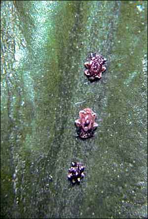 Body oval or pentagonal; convex in lateral view; body brown; with a thick wax covering; eggs laid in chamber under body of adult; ovisac absent. The following description is from Gimpel et al. (1974). Test: Wet wax pentagonal in dorsal view, hemispherical laterally, without horn, pink to reddish brown, with marginal flange, not hiding lateral filaments, without plates and nuclei. Dry wax with filaments as follows: Cephalic filament simple, apically acute; anterolateral and posterolateral filaments simple; mediolateral filaments apparently absent; caudal filaments simple; dorsal dry wax of first and second instars apparently absent, indicated only by small depression in wet wax. Stigmatic wax bands present near both spiracles, anterior band directed forward, nearly touching anteriorly, filamentous wax confined to stigmatic areas. On stems, twigs, and leaves; apparently preferring upper surfaces of leaves.