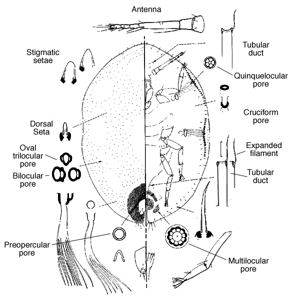 Stigmatic setae conical with sightly rounded apices; about 25 stigmatic setae laterad of each stigmatic furrow, of 2 intergrading sizes, arranged in 2 or 3 irregular rows; with dorsomedial clear area; tubular ducts without expanded inner filament, present in small numbers near anal plates and on head; dorsal setae cylindrical, apex slightly rounded or acute. Other characters: Marginal setae simple; 1 pair of prevulvar setae (often obscured by anal plates); multilocular pores abundant near vulva, with few on preceding abdominal segments; multilocular pores anterior of anterior spiracle, when present, predominantly with 5 loculi, about same size as pores laterad of anterior spiracle; tibio-tarsal sclerosis present; claw usually with small denticle; claw digitules equal; antennae usually 6-segmented, rarely with 7; area around anal region sclerotized, forming protuberance; anal plates rounded, without distinct angles; each anal plate with 1 subapical seta, 4 apical setae, and 1 subdiscal seta; anal fold with 6 fringe setae; preopercular pores inconspicuous, restricted to area anterior of anal plates; without submarginal tubercles.