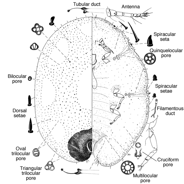 Ventral body margin with filamentous ducts; stigmatic setae hemispherical, largest seta conical with slightly rounded apex; about 34 stigmatic setae laterad of each stigmatic furrow, of 2 intergrading sizes, arranged in 3 or 4 irregular rows; with dorsomedial clear area. Other characters: Tubular ducts without expanded inner filament, present in small numbers near anal plates and on head; dorsal setae cylindrical, apex slightly rounded or acute; marginal setae simple; 1 pair of prevulvar setae (often obscured by anal plates); multilocular pores abundant near vulva, with few on preceding abdominal segments; multilocular pores anterior of anterior spiracle, when present, predominantly with 5 loculi, about same size as pores laterad of anterior spiracle; tibio-tarsal sclerosis present; claw with or without small denticle; claw digitules equal; antennae usually 7-segmented, rarely 6-segmented; area around anal region sclerotized, forming protuberance; anal plates rounded, without distinct angles; each anal plate with 2 subapical setae, 3 or 4 apical setae, and 1 subdiscal seta; anal fold with 4 fringe setae; preopercular pores inconspicuous, restricted to area anterior of anal plates; without submarginal tubercles.