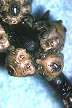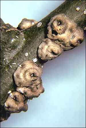 Body elliptical; convex in lateral view; body reddish brown; with a thick wax covering; eggs laid in chamber under body of adult; ovisac absent. The following description is from Gimpel et al. (1974). Test: Wet wax rectangular in dorsal view, hemispherical laterally, without horn, white in younger females, reddish brown in older specimens, with marginal flange large in older specimens, normally partially hiding lateral filaments, divided into 1 dorsal and 6 lateral plates on young females, with nuclei, plates normally absent on old specimens, without nuclei. Dry wax with filaments as follows: cephalic filament trifurcate, with rounded apices; anterolateral, posterolateral, and mediolateral filaments simple; caudal filaments weakly bifurcate; dorsal dry wax of first and second instars forming central cap, surrounded by small dorsomedial nucleus; dorsal dry wax not tilted. Stigmatic wax bands present near both pairs of spiracles, anterior bands directed dorsally, filamentous wax confined to stigmatic areas. Primarily on leaves and stems.