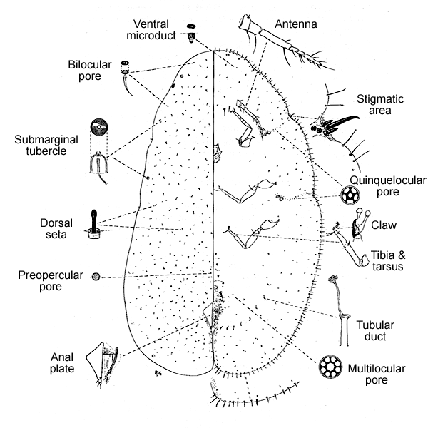 Dorsal setae clavate or capitate; ventral tubular ducts submarginal, restricted to abdomen, with 4 to 13 on body; dorsal submarginal tubular ducts absent; claw with small denticle. Other characters: Claw digitules equal in size; 1 or 2 pairs of prevulvar setae (posterior pair often obscured by anal plates); 10 to 16 submarginal tubercles around body margin; marginal setae slender, apices pointed, bifurcate, or slightly fringed; anal plates with posterior margin slightly longer than anterior margin; each anal plate with 3 apical setae, without a subdiscal seta; with 2 or 3 subapical setae on each plate; anal fold with 4 fringe setae; without tibio-tarsal sclerosis; antennae 6- or 7-segmented; stigmatic setae differentiated from other marginal setae, middle seta conspicuously longer than lateral setae; multilocular pores with 6-8 loculi; multiloculars present from segments 3 or 4 to segment 8; preopercular pores in small numbers, inconspicuous.