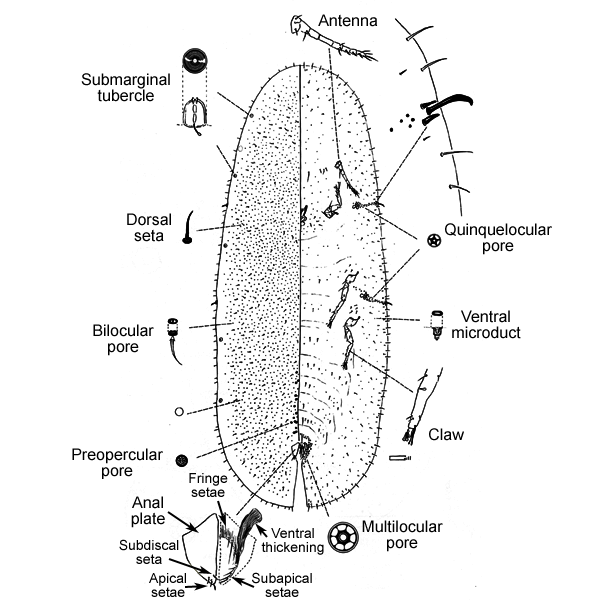 Dorsal setae filamentous, apically acute, often slightly curved; tubular ducts absent. Other characters: claw without denticle; claw digitules equal; 3 pairs of prevulvar setae (posterior pair often obscured by anal plates); 9-19 submarginal tubercles around body margin; marginal setae usually slender, apices simple, occasionally weakly fimbriate; with tibio-tarsal sclerosis; antennae 8-segmented; anal plates with posterior margin slightly longer than anterior margin; each anal plate with 3 apical setae, and 1 subdiscal seta; with 3 subapical setae on each plate; anal fold with 6 to 9 fringe setae; stigmatic setae differentiated from other marginal setae, middle seta conspicuously longer than lateral setae; multilocular pores normally with 7 loculi; multiloculars usually confined to vulvar area, 1 or 2 pores on segments 6 or 7; preopercular pores in small numbers, in narrow longitudinal line.