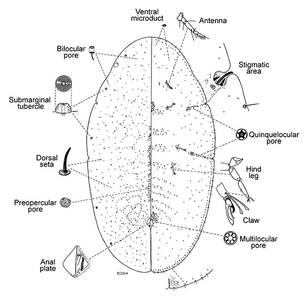 Coccus pseudohesperidum is unique among Coccus species and most likely should be placed in Mesolecanium (Gill & Nakahara 1977). It is characterized by the sclerotized dorsum, reduced legs and antennae, and lack of tubular ducts.