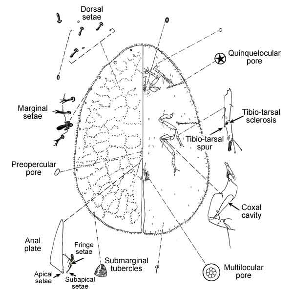 Anal plates with anterolateral margin longer than posterolateral margin, anterolateral margin more than 2 times length of posterolateral margin; tibio-tarsal spur usually present, usually apically acute, less than ¼ length of tibia; hind 2 pairs of legs conspicuously larger than front legs; hind 2 pairs of coxae with unusual cavity laterodistally; anal plates in middle or anterior part of abdomen; without tubular ducts; dorsal setae capitate; marginal setae conspicuously fringed, slightly enlarged. Other characters: Claw without denticle; claw digitules equal; 1 pair of prevulvar setae (often obscured by anal plates); 5 to 15 submarginal tubercles around body margin; stigmatic setae differentiated from other marginal setae, middle seta longer than lateral setae; each anal plate with 4 apical setae, without a subdiscal seta; with 3 subapical setae on each plate; anal fold with 4 fringe setae; with tibio-tarsal sclerosis; antennae 6-, 7-, or 8-segmented; multilocular pores normally with 5 loculi; multiloculars restricted to vulvar area; preopercular pores present in cluster near anal plates.