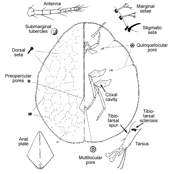 Tibio-tarsal spur present, apically acute, about ¼ length of tibia; anal plates with anterolateral margin longer than posterolateral margin, anterolateral margin less than 2 times length of posterolateral margin; hind 2 pairs of legs conspicuously larger than front legs; hind 2 pairs of coxae with unusual cavity laterodistally; anal plates in middle or anterior part of abdomen; without tubular ducts; dorsal setae capitate; marginal setae conspicuously fringed, slightly enlarged. Other characters: Claw without denticle; claw digitules equal; 1 pair of prevulvar setae (often obscured by anal plates); 7 to 16 submarginal tubercles around body margin; stigmatic setae differentiated from other marginal setae, middle seta longer than lateral setae; each anal plate with 4 apical setae, without a subdiscal seta; with 3 subapical setae on each plate; anal fold with 4 fringe setae; with tibio-tarsal sclerosis; antennae 6- or 7-segmented; multilocular pores with 5, 6, or 7 loculi; multiloculars restricted to vulvar area; preopercular pores present in cluster near anal plates.