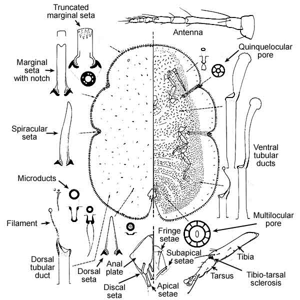 Denticle on widest part of claw; marginal setae spinose, of two types, apically truncate and apically notched; tubular ducts abundant over venter except absent from marginal areas, some with expanded filaments; discal seta present; apical and discal setae enlarged, clavate; 3-12 setae in each spiracular cleft, differently shaped than marginal setae, all about same size and shape. Other characters: Dorsal setae setae conical, with slightly rounded apex; claw digitules equal; 2 pairs of prevulvar setae (posterior pair often obscured by anal plates); submarginal tubercles absent; anal plates with posterior and anterior margins about equal; each anal plate with 3 apical setae, without a subdiscal seta; with 2 or 3 subapical setae on each plate; anal fold with 4 fringe setae; third antennal segment unusually long; tibio-tarsal articulation present with tibio-tarsal sclerosis; antennae 8-segmented; dorsal tubular ducts present; multilocular pores normally with 10 loculi; multiloculars usually present on all abdominal segments; preopercular pores absent.