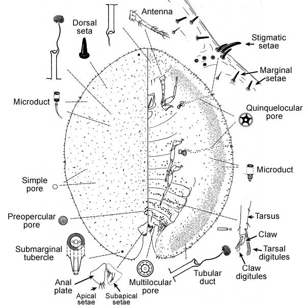 Marginal setae spinose; ventral tubular ducts in submarginal areas from posterior abdomen forward to head. Other characters: Multilocular pores with 10 loculi, present on abdomen and thorax; 0-21 submarginal tubercles around body margin; dorsal setae enlarged, apically rounded, not capitate, larger setae in medial areas; dorsal tubular ducts scattered over surface; claw with small denticle; claw digitules unequal; 3 pairs of prevulvar setae (posterior pair often obscured by anal plates); each anal plate with 4 apical setae, without a subdiscal seta; with 2 subapical setae on each plate; anal fold with 4 fringe setae; without tibio-tarsal sclerosis, not articulated; antennae 6-, 7- or 8-segmented (usually with 7); stigmatic setae differentiated from other marginal setae, middle seta conspicuously longer than lateral setae; preopercular pores in small numbers anterior of anal plates, conspicuous.