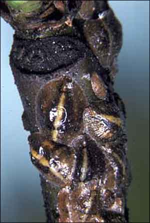 Shape and coloration highly variable depending on host plant and age of the scale. Body usually oval or round. Dead females are leathery brown and vary in profile from slightly convex to pyramidal or hemispherical. Ebeling (1938) published an excellent study on the effects of host plants on the shape of this scale. Coloration of living stages varies with the time of the year and part of the plant infested. Stages on the leaves are usually semitransparent yellow-green; stages on twigs are mottled yellow and brown. Eggs are laid under the body of the female and there is no ovisac. Occurring on arboreal parts of plant. Males are present but are uncommon; the species is thought to be parthenogenetic.