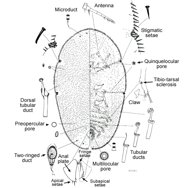 Dorsal setae absent; marginal setae spinose; with large submarginal tubercles (two-ringed ducts) located submarginally, restricted to head and posterior abdomen, less than 10 on each side of body; 4 apical setae on each anal plate, without discal setae; tubular ducts abundant on both surfaces. Other characters: Multilocular pores predominantly with 10 loculi, present on abdomen; usually with 3 stigmatic setae in each furrow, usually larger than marginal setae, with rounded apices, often interspersed with marginal setae; claw without a denticle; claw digitules large, equal; 3 pairs of prevulvar setae (posterior pair often obscured by anal plates); each anal plate with 3 subapical setae, 4 apical setae, anal fold with 2 fringe setae; with conspicuous tibio-tarsal sclerosis; antennae 8-segmented; preopercular pores scattered over dorsal surface.