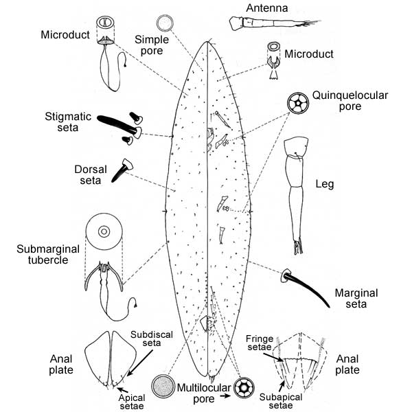 Legs reduced, trochanter and femur fused, tibia and tarsus usually fused; antennae reduced to 3 to 5 segments; tubular ducts absent. Other characters: Multilocular pores predominantly with 7 loculi, primarily restricted to vulvar area, rarely present on 1 or 2 adjacent segments; anal plates with anterolateral margin about same length as posterolateral margin; anal plates near posterior end of body; dorsal setae variable, usually spine like, with bluntly pointed to rounded apices; marginal setae short, slender, apices rounded; claw without denticle; claw digitules unequal; 3 pairs of prevulvar setae (posterior pair often obscured by anal plates); 8 to 19 submarginal tubercles around body margin; stigmatic setae differentiated from other marginal setae, middle seta longer than lateral setae; each anal plate with 3 apical setae and 1 subdiscal seta; with 2 subapical setae on each plate; anal fold with 4 fringe setae; without tibio-tarsal sclerosis; preopercular pores present in cluster anterior of anal plates.