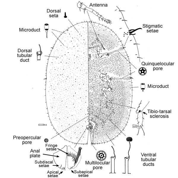 More than half of marginal setae acute, remaining setae weakly fimbriate; without submarginal tubercles; each anal plate with 3 apical setae and 1 subdiscal seta; with 2 or 3 subapical setae on each plate; anal fold with 4 or 6 fringe setae; ventral tubular ducts scattered over venter; multilocular pores normally with 7 loculi. Other characters: Multiloculars present in vulvar area forward to segment 2, especially submarginally; dorsal tubular ducts present; tibio-tarsus articulated, with sclerosis; claw without denticle; claw digitules equal; 3 pairs of prevulvar setae (posterior pair often obscured by anal plates); stigmatic setae differentiated from other marginal setae, middle seta longer than lateral setae; anal plates with posterior margin about equal in length to anterior margin; antennae 8-segmented; preopercular pores inconspicuous, restricted to area anterior of anal plates.