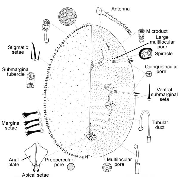 Marginal setae mostly broadly fimbriate; multilocular pores anterior of anterior spiracle predominantly with more than 5 loculi, conspicuously larger than pores laterad of anterior spiracle; 10-14 submarginal tubercles. Other characters: Each anal plate with 4 apical setae and no subdiscal seta; with 3 subapical setae on each plate; anal fold with 4 fringe setae; ventral tubular ducts scattered over venter; multilocular pores normally with 10 loculi; multiloculars present in vulvar area forward to segment 2; dorsal tubular ducts present; tibio-tarsus articulated, with sclerosis; claw without denticle; claw digitules equal; 3 pairs of prevulvar setae (posterior pair often obscured by anal plates); stigmatic setae differentiated from other marginal setae, middle seta longer than lateral setae; anal plates with posterior margin about equal in length to anterior margin; antennae 8-segmented; preopercular pores inconspicuous, restricted to area anterior of anal plates.