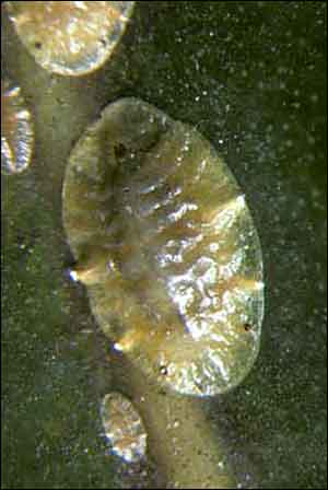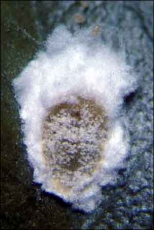 Body oval; relatively convex in cross section; body green in young females, as specimens mature, changing darker medially, completely brown after oviposition; with white fluffy wax covering dorsum at time of oviposition; ovisac produced beneath and behind female, slightly convex, with weakly indicated medial groove, white, flocculent, about 1 time length of body. Occurring on leaves and stems; oviposition on twigs or leaves. Males apparently rare. Eggs laid inside ovisac.