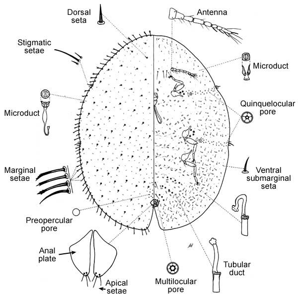 Body oval; slightly convex in cross section; body yellow or light green in young females, as specimens mature becoming brown; without obvious wax covering; ovisac produced beneath and behind female, slightly convex, with ribbed appearance, white, flocculent, 2 to 3 time length of body. Occurring on leaves, stems and roots; oviposition on twigs, leaves, or roots. Eggs laid inside ovisac.