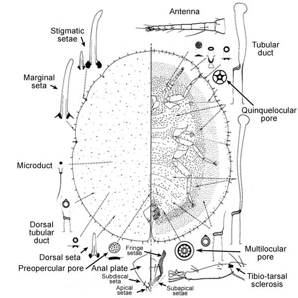 Marginal setae spinelike, usually curved, with simple apices; without submarginal tubercles; anal plates each with 1 subdiscal seta. Other characters: Each anal plate with 3 apical setae and 2 or 3 subapical setae; anal fold with 4 fringe setae; ventral tubular ducts scattered over surface; multilocular pores normally with 10 loculi; multiloculars present in vulvar area forward to segment 2; dorsal tubular ducts present; tibio-tarsus articulated, with sclerosis; claw with minute denticle; claw digitules equal; 3 pairs of prevulvar setae (posterior pair often obscured by anal plates); stigmatic setae differentiated from other marginal setae, middle seta longer than lateral setae; anal plates with posterior margin about equal in length to anterior margin; antennae 8-segmented; preopercular pores relatively conspicuous, restricted to area anterior of anal plates.