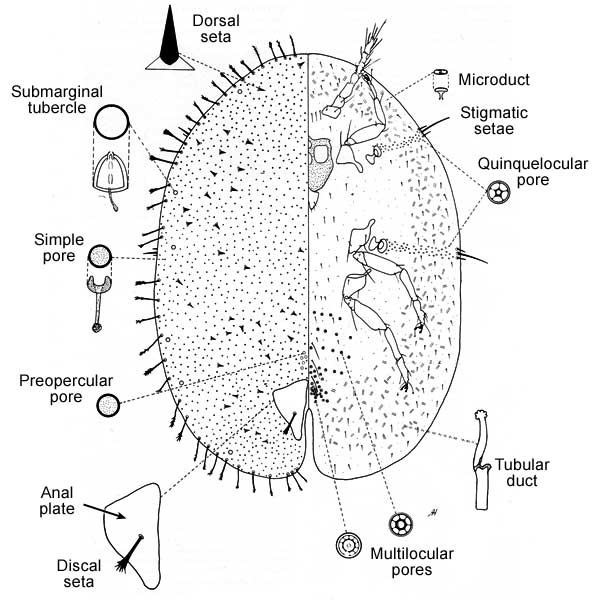 Marginal setae broadly fimbriate; anal plates with conspicuous discal seta; discal seta fimbriate; tibio-tarsus not articulated, without sclerosis; ventral submarginal tubular ducts with narrow filament; derm with areolations in older females. Other characters: Dorsal tubular ducts absent; with numerous submarginal dome-shaped tubercles; each anal plate with 3 apical setae and no subdiscal seta; with 3 subapical setae on each plate; anal fold with 6 to 8 fringe setae; ventral tubular ducts restricted to submarginal areas; multilocular pores normally with 10 or more loculi; multiloculars present in vulvar area forward to segment 2; multilocular pores anterior of anterior spiracle predominantly with 5 loculi, about same size as pores laterad of anterior spiracle; claw without denticle; claw digitules equal; 3 pairs of prevulvar setae (posterior pair often obscured by anal plates); stigmatic setae differentiated from other marginal setae, middle seta longer than lateral setae; anal plates with posterior margin about equal to or slightly longer than length of anterior margin; antennae usually 8-segmented; preopercular pores conspicuous, restricted to area anterior of anal plates.