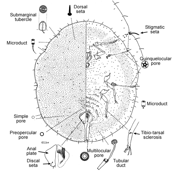 Marginal setae simple or slightly fimbriate; anal plates with conspicuous discal seta; discal seta not fimbriate; tibio-tarsus not articulated, with tibio-tarsal sclerosis; ventral submarginal tubular ducts with narrow filament; derm with areolations in older females. Other characters: Dorsal tubular ducts absent; with numerous submarginal dome-shaped tubercles; each anal plate with 3 or 4 apical setae and no subdiscal seta; with 3 subapical setae on each plate; anal fold with 5 to 8 fringe setae, normally 6; ventral tubular ducts restricted to submarginal areas; multilocular pores normally with 10 loculi; multiloculars present in vulvar area forward to segment 2; multilocular pores anterior of anterior spiracle predominantly with 5 loculi, about same size as pores laterad of anterior spiracle; claw without denticle; claw digitules equal; 3 pairs of prevulvar setae (posterior pair often obscured by anal plates); stigmatic setae differentiated from other marginal setae, middle seta longer than lateral setae; anal plates with posterior margin about equal to or slightly longer than length of anterior margin; antennae usually 8-segmented; preopercular pores conspicuous, restricted to area anterior of anal plates.