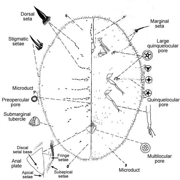 1 pair of prevulvar setae (often obscured by anal plates); with many submarginal tubercles; dorsal setae conical arranged in lines; without tubular ducts; marginal setae simple, with acute apices; anal plates with conspicuous discal seta; without tibio-tarsal articulation or sclerosis. Other characters: Each anal plate with 3 apical setae and no subdiscal seta; with 4 to 7 subapical setae on each plate; anal fold with 4 fringe setae; multilocular pores normally with 8 loculi; multiloculars present in vulvar area only; multilocular pores anterior of anterior spiracle predominantly with 5 loculi, about same size as pores laterad of anterior spiracle; claw with small denticle; claw digitules equal; tibia and tarsus partially fused; stigmatic setae differentiated from other marginal setae, middle seta longer than lateral setae; anal plates with posterior margin about equal to length of anterior margin; antennae usually 6-segmented; preopercular pores conspicuous, present in longitudinal line from mesothorax to anal area.