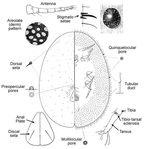 Marginal setae usually slightly fimbriate; anal plates with anterior margin longer than posterior margin located in middle of abdomen or toward hind legs; anal plates with conspicuous discal seta with fimbriate apex and 4 or more apical setae. Other characters: Tibio-tarsus slightly articulated, with tibio-tarsal sclerosis; ventral submarginal tubular ducts with narrow filament; derm with areolations in older females; dorsal tubular ducts absent; dorsal setae with acute or slightly rounded apices, slightly enlarged; without submarginal tubercles; with 3 subapical setae on each plate; anal fold with more than 6 fringe setae; ventral tubular ducts restricted to submarginal areas; multilocular pores with 10 locular pores; multiloculars present in vulvar area only; multilocular pores when present anterior of anterior spiracle predominantly with 5 loculi, about same size as pores laterad of anterior spiracle; claw without denticle; claw digitules equal; 3 pairs of prevulvar setae (posterior pair often obscured by anal plates); stigmatic setae differentiated from other marginal setae, middle seta longer than lateral setae; antennae usually 8-segmented; preopercular pores conspicuous, restricted to area anterior of anal plates.