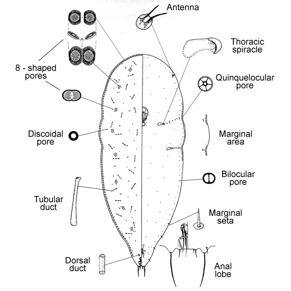 Test pear-shaped; flat or slightly convex in lateral view; test green, brown, or translucent pale yellow; body covered by translucent test with faint medial carina and transverse striations. Marginal areas with white or salmon wax filaments. Mature tests with shriveled body of female at anterior end. Occurring on stems and both leaf surfaces.