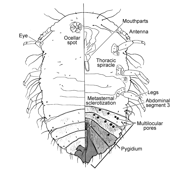 Antennae 4-segmented; multilocular pores absent from thorax, normally absent from abdominal segments 2 and 3, rarely with 1 or 2 on each side of segment 3, never in cluster of 2 to 5, present in rows from submarginal areas to submedial areas; without tubular ducts on abdomen. Other characters: legs reduced, tibia and tarsus fused, trochanter and femur fused; metasternal sclerotization present; ocellar spot present; pygidium present.