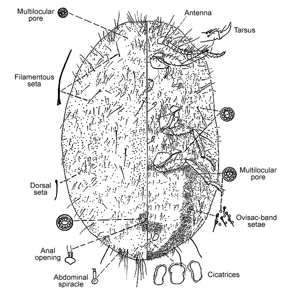 3 cicatrices posterior of vulva, all about the same length; 3 pairs of abdominal spiracles; marginal setae elongate, up to 350µ; ovisac band with numerous filamentous setae, without separate setal base; ovisac wide, with band of 7 or 8 pores comprising width of band in area between posterior coxae; predominant pore in ovisac band with 3 loculi in center and 8 or 9 loculi in outer ring; some of dorsomedial setae conspicuously large; large open center pores absent; antennae 10- or 11-segmented. Other characters: Thoracic and abdominal spiracles simple, without pores in atrium; anal opening simple with sclerotized rim internally.