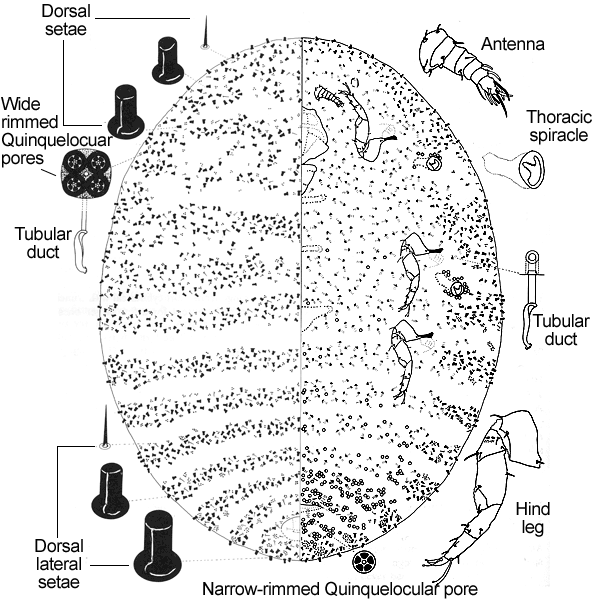 Dorsal setae robust, apices truncate, about same size on head as on abdomen of approximately 1 size only; tubular ducts abundant, most quinquelocular pore clusters with 1 or 2 associated tubular ducts; ventral wide-rimmed quinquelocular pore clusters absent from medial areas of thorax and abdomen; ventral narrow-rimmed quinquelocular pores sometimes abundant in medial areas of abdomen, uncommon on thorax; anterior portion of anal ring with thin sclerotization. Other characters: Hind femur with large translucent pores; antennae 7-segmented; quinquelocular pores arranged in clusters; anal ring without setae.