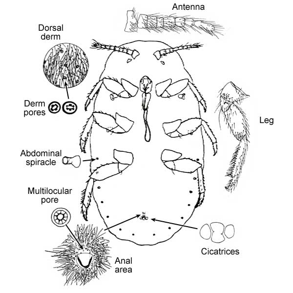 7 pairs of abdominal spiracles, without pores in atrium; without ovisac band; 3 cicatirices near vulva (often difficult to see); thoracic spiracles simple, without pores in atrium; without spines, but with many setae; antennae 8- or 9-segmented; labium 3-segmented; multilocular pores simple, usually with 5 to 7 loculi, sometimes more near vulva. Other characters: Claw digitules thin, not reaching tip of claw; anal ring with single row of polygonal pores, often difficult to see because of sclerotization.