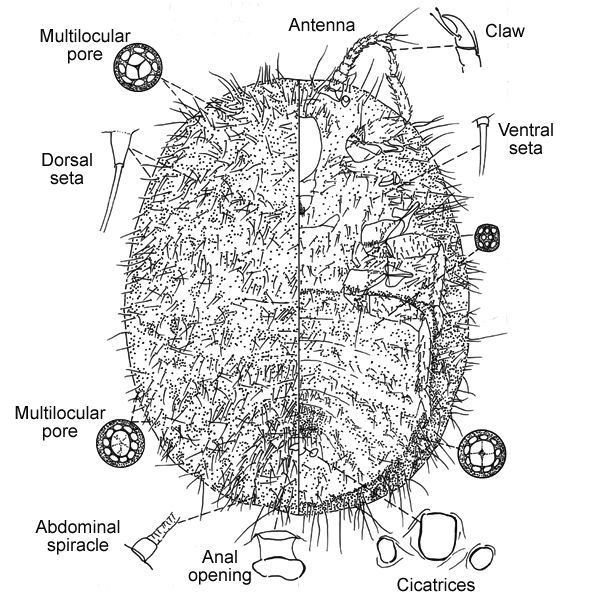 Body brown, legs and antennae black, covered by thick layer of white to cream colored wax, divided into 16 to 20 areas, marginal areas with fringe of wax processes, shorter on head and thorax, posterior processes long. Morrison (1921) mentions wax as lemon yellow and suggests that there is no ovisac. Eggs laid either inside ovisac or under body of female. Males are reported by Leonardi (1907).