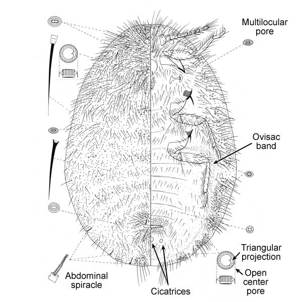3 pairs of abdominal spiracles; large open center pores present around body margin and in dorsomedial area of head and throax, with triangular projection on inner rim; 3 cicatrices posterior of vulva; all cicatrices round, lateral pair smaller than medial cicatrix; body covered with long hairs; antennae usually 11-segmented; ovisac band thin, in most places 2 or 3 pores wide. Other characters: Thoracic and abdominal spiracles simple, without pores in atrium; anal opening simple with sclerotized rim internally.