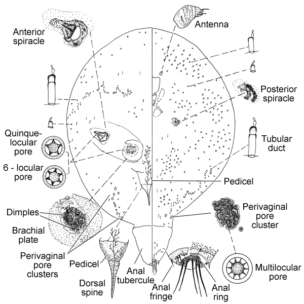 Body of adult female red, covered by a pliable test that is slightly convex with 10 small lobes around body margin in newly formed tests, but highly convex and rotund in mature tests; test has 3 openings, anal opening for exit of honeydew and crawlers and spiracular openings for respiratory functions, all 3 openings have protruding white wax; tests are either light reddish brown or yellow; individuals coalesce in heavy infestations forming encrustations that may cover entire branches; male's test is elongate and reddish brown with an operculum at posterior apex which is important for exit of the adult. Crawlers and adult males are bright red; males are winged or wingless. Occurring on small branches and twigs. Males are relatively common but apparently are not needed for reproduction.
