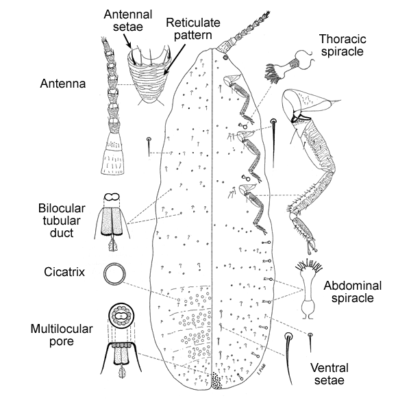 Apical cluster of multilocular pores, composed of 80 to more than 100 pores; dorsal cicatrices restricted to dorsum, in 4 segmental rows, with more than 160 on body; hind pair of trochanters each with 1 long seta; enlarged setae on antennal segments 5 to 9. Other characters: 7 pairs of abdominal spiracles, similar to thoracic spiracles; without distinct anal opening; tarsi 2-segmented; antennae with reticulate pattern; basal antennal segment noticeably longer than other segments; with 9 antennal segments; coxa divided longitudinally; without campaniform sensilla on tarsus; with 2 capitate claw digitules.