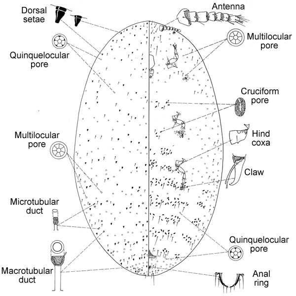 Anal ring without pores; dorsum with truncate enlarged setae in addition to filamentous setae; multilocular pores on dorsum and venter; cruciform pores present on venter medially on thorax and abdomen, laterally on abdomen; antennae 7-segmented; microtubular ducts small, with 2 sclerotized areas internally and simple orifice; macrotubular ducts restricted to posterior abdomen. Other characters: Without protruding anal lobes; hind coxae with few large translucent pores.