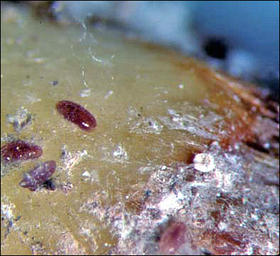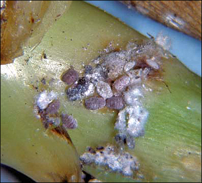Body oval, lightly dusted with white mealy wax, pink body shows through wax, with 2 longitudinal lines of brown blotches on dorsum; usually with strands of filamentous wax at posterior end of body. Males form wax cocoons on undersides of leaves. Usually completely hidden in sheaths of host near base.