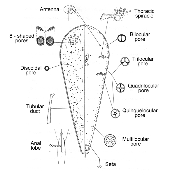 Two dorsal clusters of large 8-shaped pores present on head; continuous row of small 8-shaped pores around body margin; submarginal quinquelocular pores present from anterior of antennae to midabdomen, not contiuous between antennae; multilocular pores present near vulva; discoidal pores scattered over dorsum but not forming submarginal row; ventral anal lobe unsclerotized. Other characters: Legs absent; antennae 1-segmented; without a pygidium; 8-shaped pores prevalent.