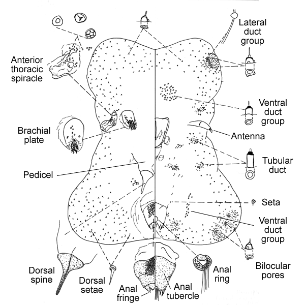 Body with 4 lobes; ventral duct groups anterior of mouthparts in 2 discrete clusters; 2 groups of ventral ducts posterior of each hind spiracle; less than 30 pseudospines on brachial plate; anal ring entire, not divided; anal fringe irregular. Other characters: One pair of spiracles conspicuously larger than other; conspicuous brachial plate with many pseudospines; dorsal spine present anterior of anal opening; anal area with associated anal fringe; legs absent; antennae poorly developed.