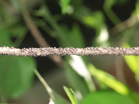 Body of adult female covered by a hard resinous cover or test that is uniquely shaped like an “X” or “bow tie” with 4 prominent lobes; test is light to dark reddish brown but may turn black when covered with sooty mold. Body is the same shape as the test; crawlers are bright red. Occurring on small branches and twigs; sometimes coalescing into encrustations that cover the surface of the twigs. Males have not been found in Florida; the species is thought to be parthenogenetic.