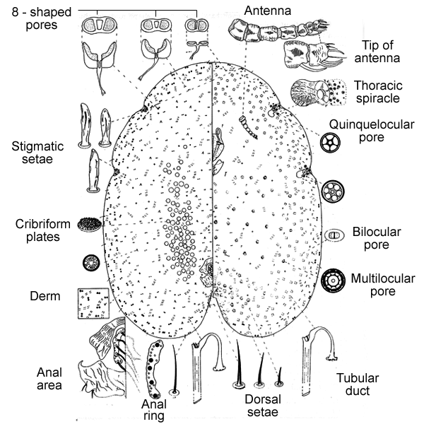 Cribriform plates numbering more than 15 on each side of body, occurring on thorax and abdomen; 2 rows of multilocular pores on thorax; legs absent; antennae 7-segmented; marginal row of 8-shaped pores; stigmatic furrow sclerotized at body margin, with stigmatic setae; anal ring with 5 pairs of setae. Other characters: Invaginated tubular ducts present; anal area with arch plate.