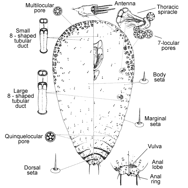 8-shaped ducts abundant on both surfaces, of 2 sizes, weakly sclerotized; apex of abdomen without sclerotization; quinquelocular and 6- and 7-locular pores on abdomen primarily arranged in rows 2 or 3 pores wide, in clusters on anterior thorax and head. Other characters: Legs absent; antennae 1-segmented; without a pygidium; 8-shaped pores absent; anal ring without setae.