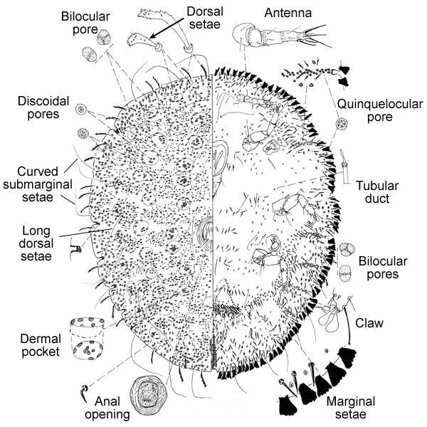 Body oval, chestnut brown, flattened dorsally but with margin raised off host surface like edge of coin, body margin crenulate; anal opening near center of body; body segmentation deeply grooved in submarginal areas, also with series of deep pits; mealy wax beneath body; somewhat similar in appearance to soft scales but raised body margin and anal opening position distinctive. Not forming ovisac. Males present. Immatures reddish brown. Occurring on stems, small branches, fruit, and roots of host.