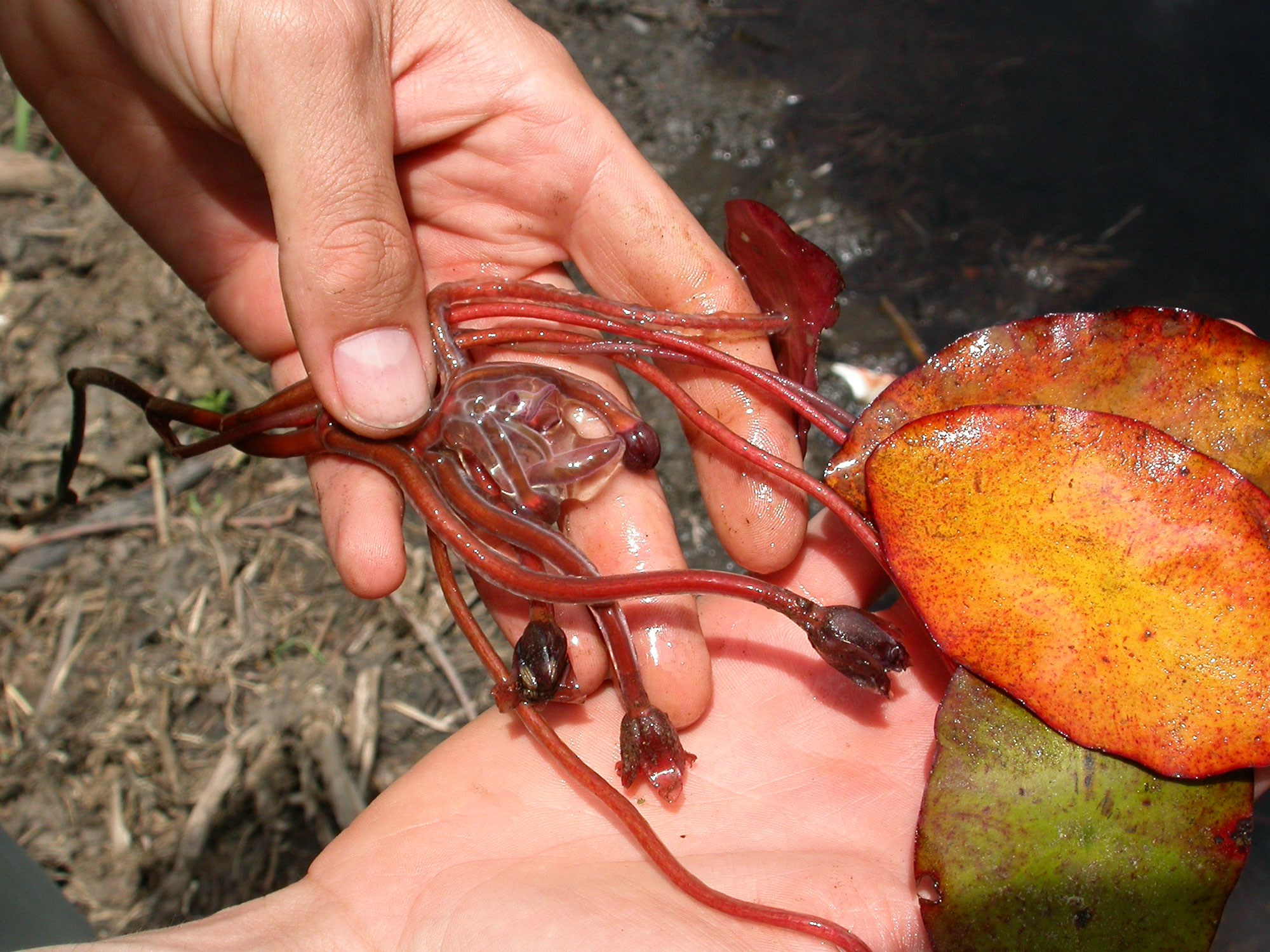 Perennial. Creeping, stoloniferous stem rooted at nodes. Leaves floating (seedling leaves submersedsubmersed: