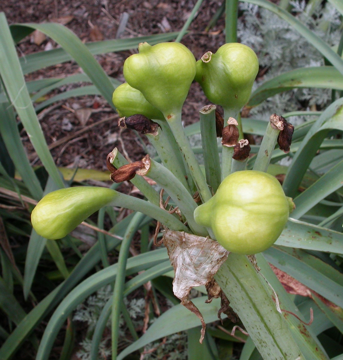 of 6 tepals, long-tubular at base, lobes subequal; stamens 6, with long filaments. Dispersal by seed or occasionally by small bulbils produced from main bulb.