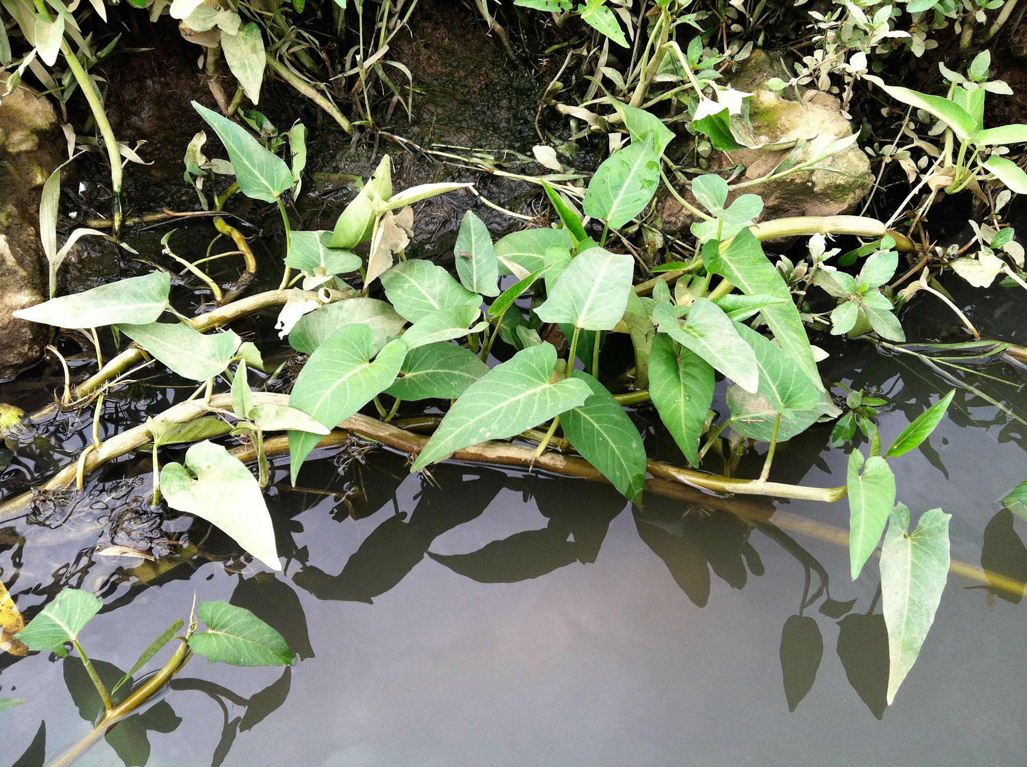 Identification: No single diagnostic feature distinguishes Ipomoea aquatica. Rather, a combination of features may help to distinguish it from other, particularly aquatic, species in the genus: With milky sap. Stems hollow, floating when in water, to 3 m long and can be much longer, rooted at nodes. Petioles 3-14 cm long. Leaf blades held erect above water when stems floating, variable in shape, usually narrowly triangular, sagittatesagittate: