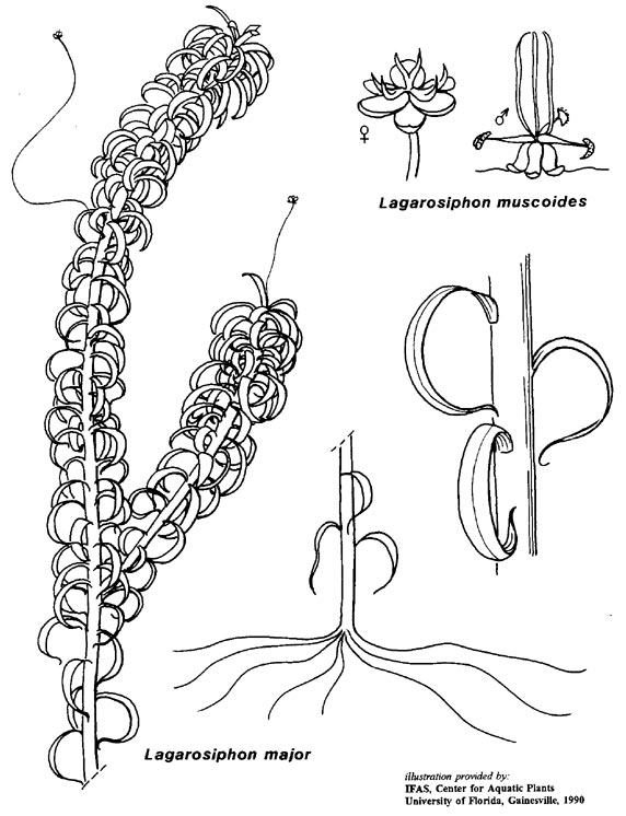 Identification: Lagarosiphon major is distinguishable by its relatively large, recurvedrecurved: